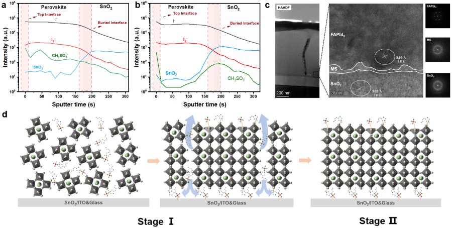 图1 (a-c)TOF-SIMS表征元素分布,(c)截面TEM,(d)MS原位双侧界面钝化示意图