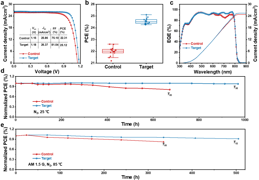 图2 (a-c)最优太阳能电池性能曲线,(d-e)光伏器件稳定性对比图
