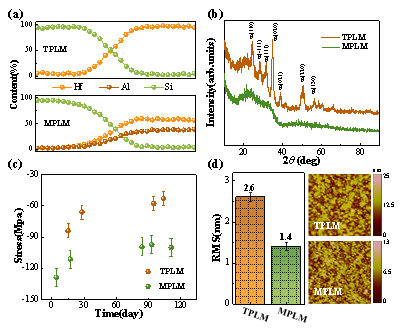 图1. TPLM和MPLM:(a)低折射率层到高折射率层的元素百分比分布图,(b)XRD图谱,(c)薄膜应力老化行为,(d)表面形貌