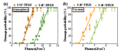 图2. TPLM和MPLM的激光损伤概率:(a)大气环境,(b)真空环境