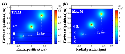 图3. (a)TPLM和(b)MPLM中位于第一、第二和第三个高电场峰值位置的吸收性缺陷的模拟温升分布