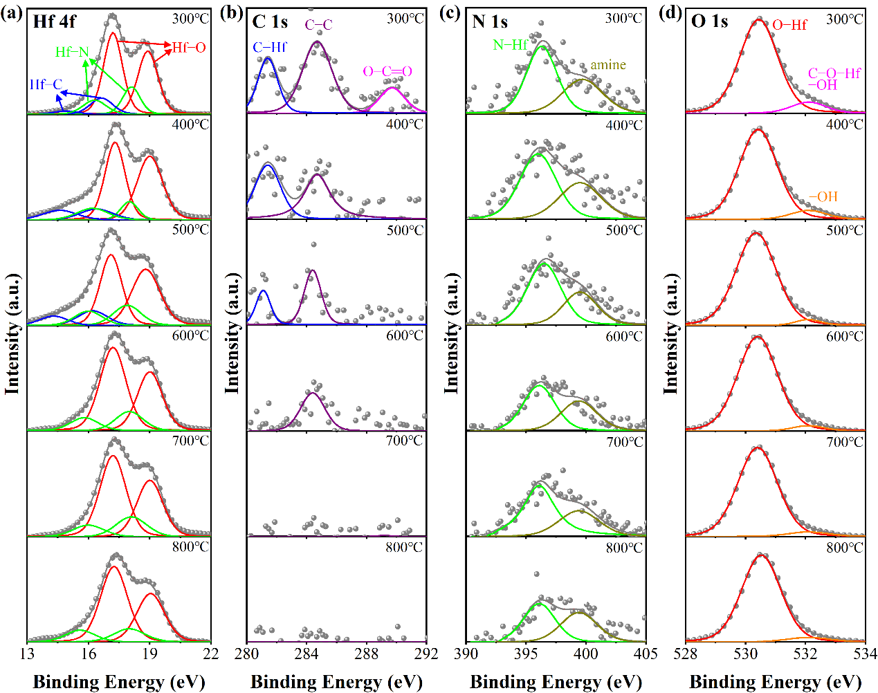 图1. 不同温度下氧气退火的HfO2薄膜的XPS能谱:(a)Hf 4f,(b)C 1s,(c)N 1s和(d)O 1s