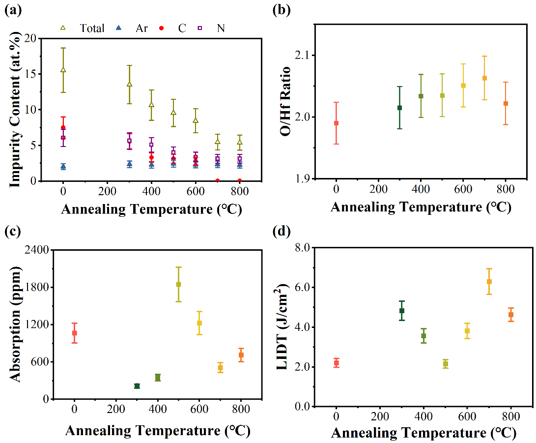 图2. 不同温度下氧气退火的HfO2薄膜:(a)杂质含量,(b)O/Hf比,(c)吸收和(d)LIDT
