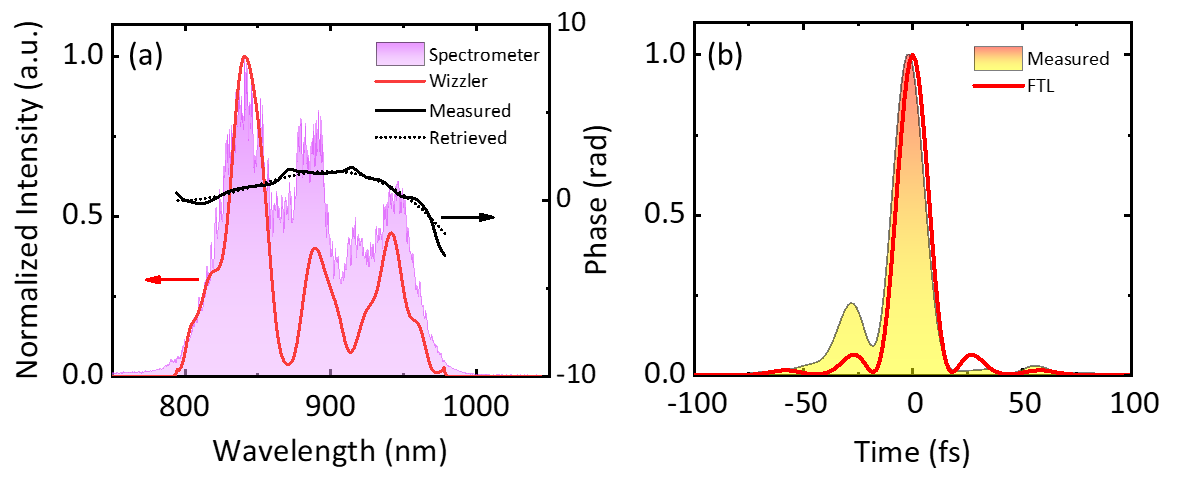 研究人员采用超连续谱产生结合飞秒光学参量放大技术,通过级联光参量放大和精密色散控制技术获得了重复频率1kHz、与超宽带光学参量放大匹配的910nm中心波长、高于100微焦的脉冲能量、大于200nm的超宽带宽、小于15fs的脉冲宽度、优于1012的超高时间对比度以及时空质量优良的输出,综合性能满足了100拍瓦激光系统的要求。目前该种子源已投入工程应用,为后续系统的研制提供基础与保障。