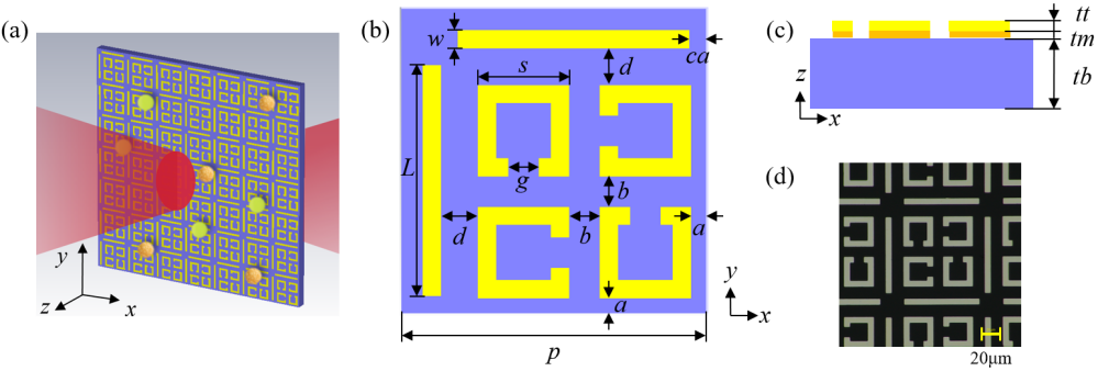 图1. (a)太赫兹超表面检测两种葡萄球菌示意图。太赫兹超表面单元结构示意图:(b)俯视图;(c)侧视图。(d)太赫兹超表面显微图。