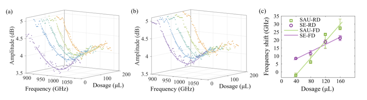 图2. 不同(a) SAU和(b) SE菌液剂量下的实测太赫兹超表面透射谱(散点)及对应拟合曲线(实线)。(c)共振频移量随菌液剂量的变化关系(含误差棒)。