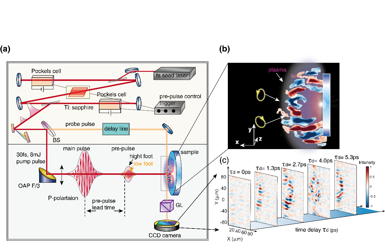 近日,中国科学院上海光机所超强激光科学与技术全国重点实验室李儒新院士和田野研究员团队,实现了基于超强超短激光精密调控等离子体的亚相对论量级无碰撞激波,激波速度达到0.03倍光速(约107m/s)。团队创新性地采用纳秒时域双脉冲强度参数的精密调控方法,利用该时域结构型脉冲驱动等离子体,发现了自组织强磁场(最高值5000T)介导产生了亚相对论无碰撞激波,在受控条件下复现了激波速度相当的银河系最年轻超新星遗迹SNR G1.9+0.3的极端物理环境。相关工作以“Observation of sub-relativistic collisionless shock generation and breakout dynamics”为题,4月28日发表在国际期刊《自然通讯》杂志。