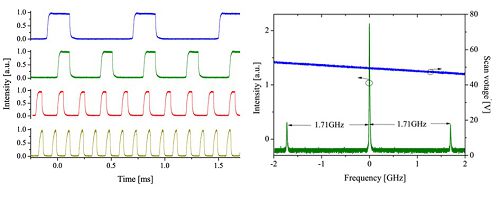 图1 左:钠导星激光的重复率与脉宽调谐;右:带再泵浦分量的钠导星激光输出精细光谱
