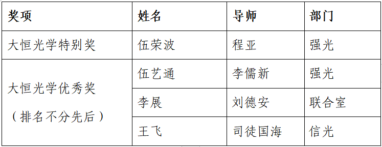 近日,中国科学院前沿科学与教育局公布了2020年度中国科学院各项冠名奖学金的评审结果(科发前函字〔2020〕14号),我所四名博士研究生荣获2020年中国科学院大恒光学奖学金,其中2019级硕博连读生伍荣波荣获大恒光学特别奖(全院仅5人)。具体获奖名单如下: