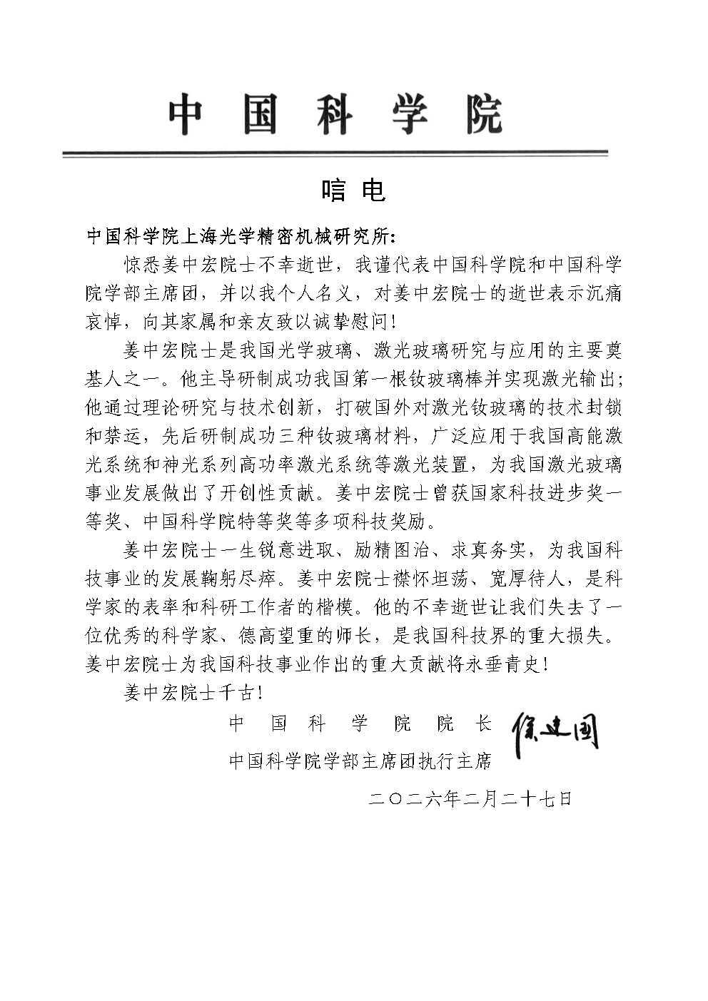 中国科学院学部主席团执行主席、中国科学院院长侯建国 唁电