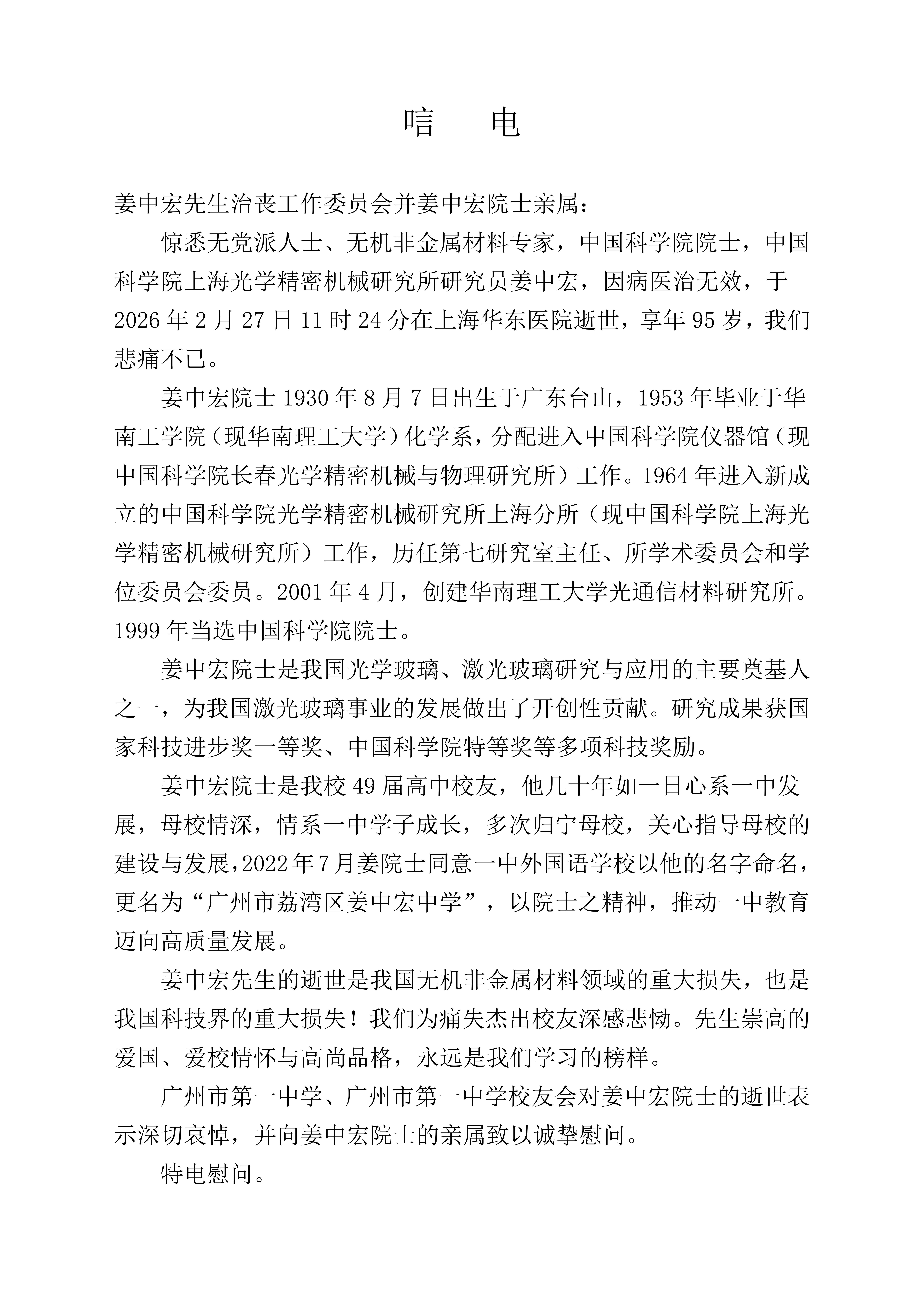 广州市第一中学 唁电