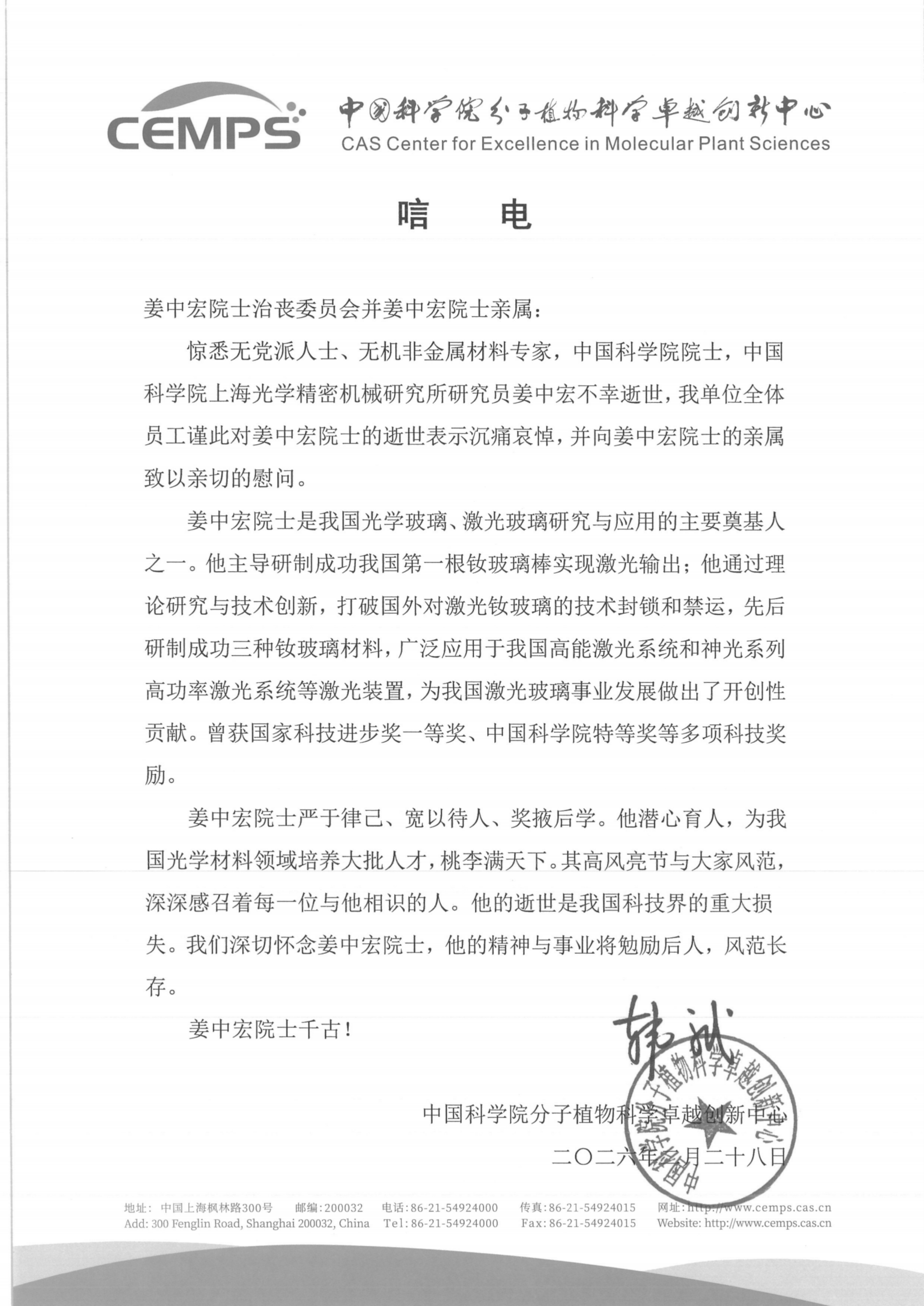 中国科学院分子植物科学卓越创新中心 唁电