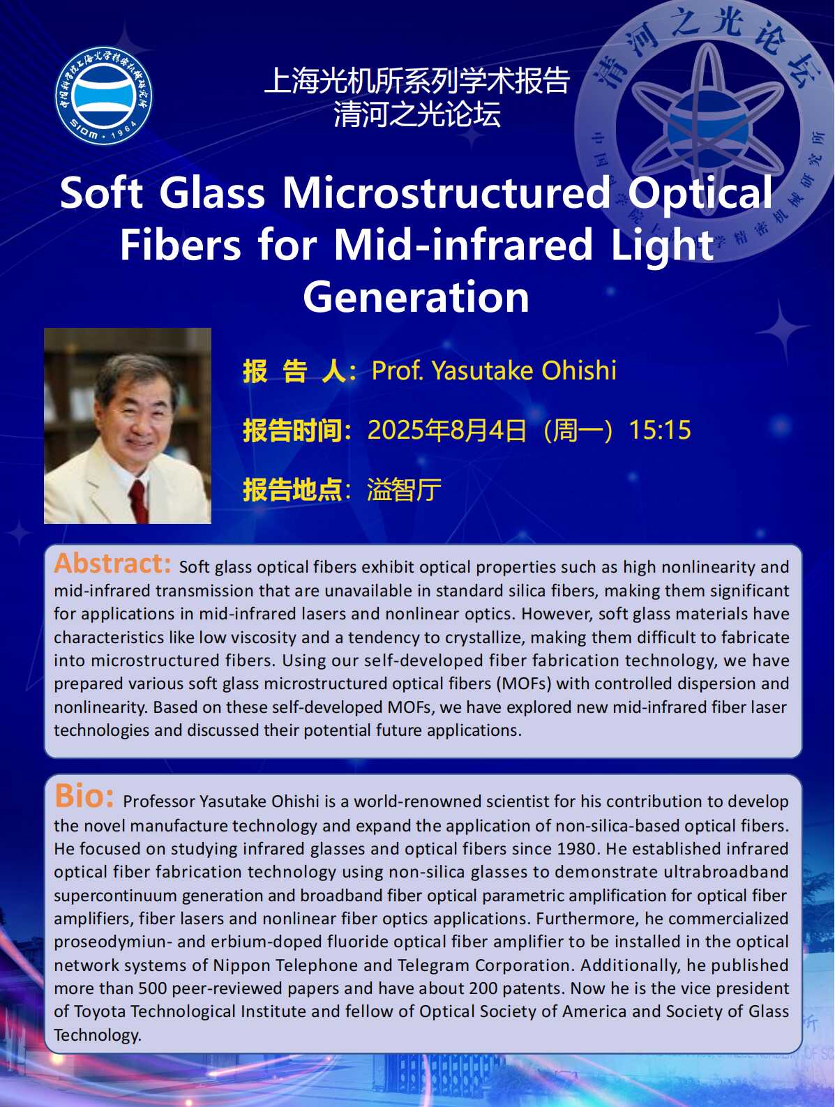 Soft glass optical fibers exhibit optical properties such as high nonlinearity and mid-infrared transmission that are unavailable in standard silica fibers, making them significant for applications in mid-infrared lasers and nonlinear optics. However, soft glass materials have characteristics like low viscosity and a tendency to crystallize, making them difficult to fabricate into microstructured fibers. Using our self-developed fiber fabrication technology, we have prepared various soft glass microstructured optical fibers (MOFs) with controlled dispersion and nonlinearity. Based on these self-developed MOFs, we have explored new mid-infrared fiber laser technologies and discussed their potential future applications. |