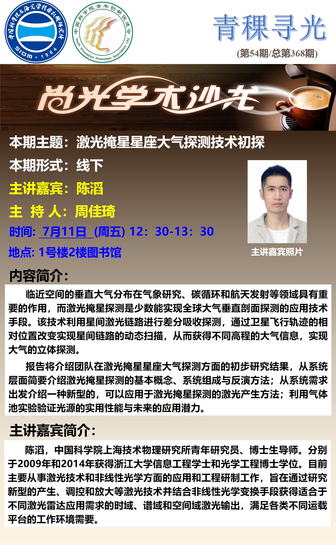 陈滔,中国科学院上海技术物理研究所青年研究员、博士生导师。分别于2009年和2014年获得浙江大学信息工程学士和光学工程博士学位。目前主要从事激光技术和非线性光学方面的应用和工程研制工作,旨在通过研究新型的产生、调控和放大等激光技术并结合非线性光学变换手段获得适合于不同激光雷达应用需求的时域、谱域和空间域激光输出,满足各类不同运载平台的工作环境需要。