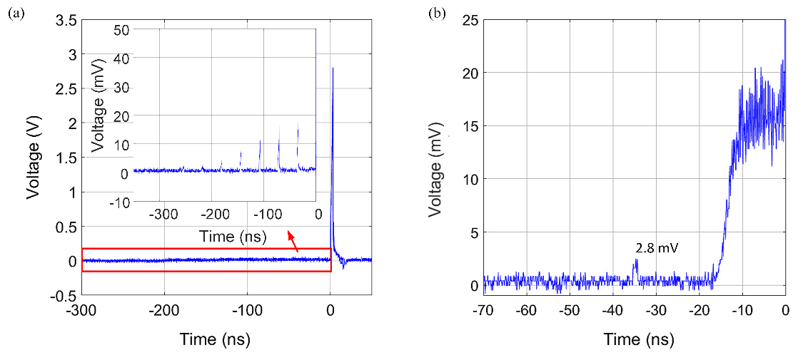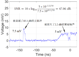 该课题组基于单纵模长脉冲削波整形方法和纳秒毫焦耳级钕玻璃再生激光放大技术,详细研究了激光注入系统的噪声来源(图1为激光注入系统输出的时域波形),并探讨了噪声对高功率激光装置的影响。同时,利用高速电光调制技术,采用高消光比的电光强度调制器和时间脉冲整形器件,对输出的纳秒时间脉冲形状进行整形处理,设计了一种检测纳秒激光脉冲信噪比的方法。该方法能够实现动态范围50dB,精度1dB的测量,并对高功率激光装置激光注入系统种子源的信噪比进行了检测,为47.06dB,已经达到目前同类装置的较高水平(如图2所示)。
