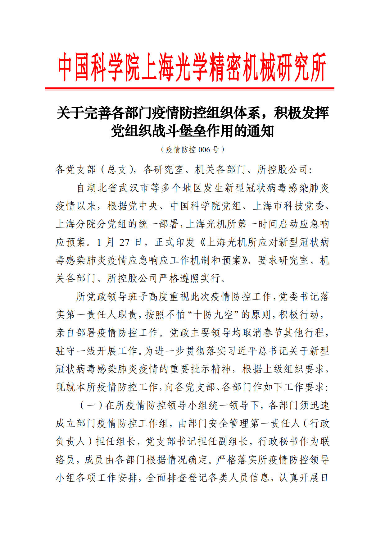 关于完善各部门疫情防控组织体系,积极发挥党组织战斗堡垒作用的通知(疫情防控006号)