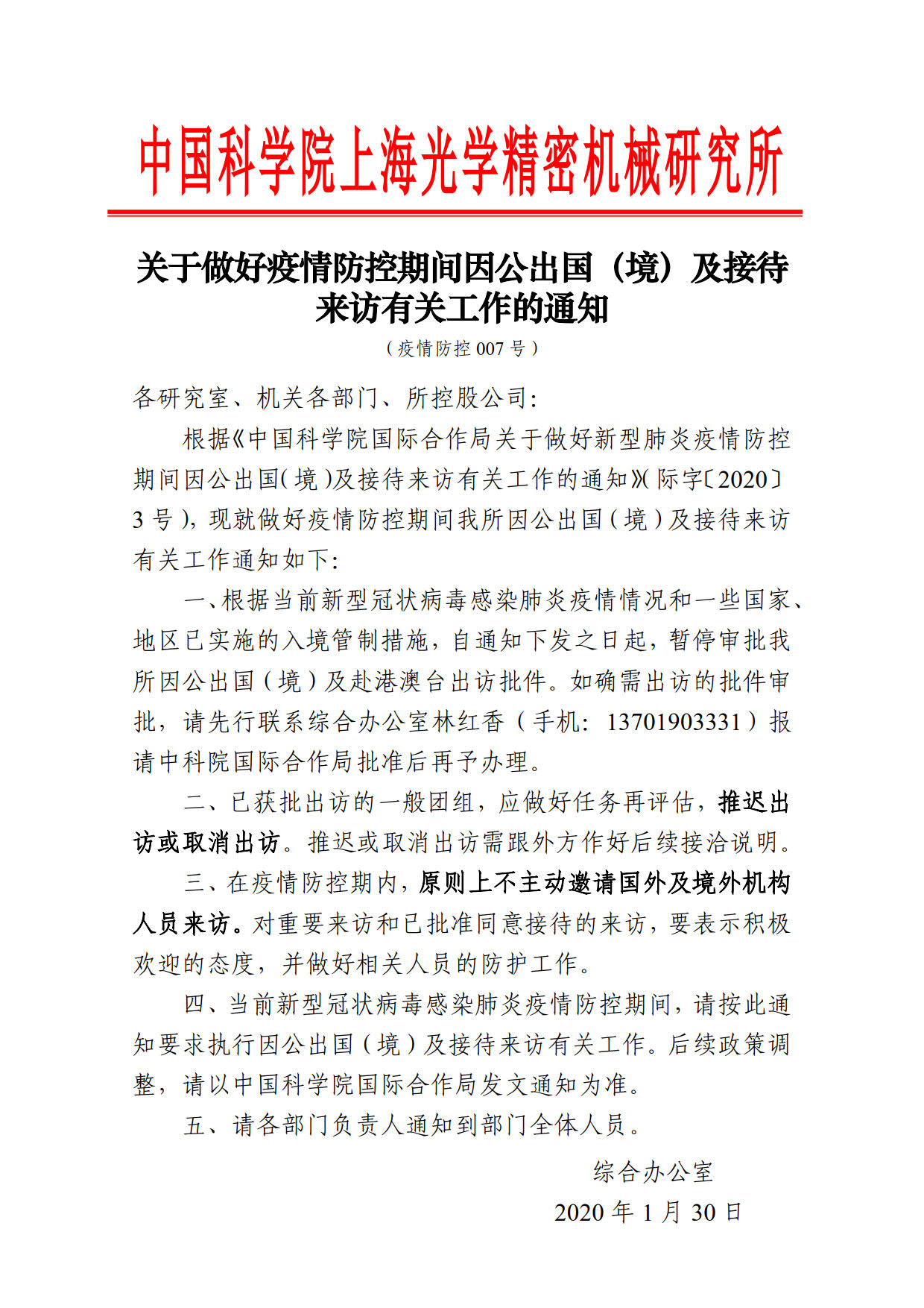 关于做好疫情防控期间因公出国(境)及接待来访有关工作的通知(疫情防控007号)