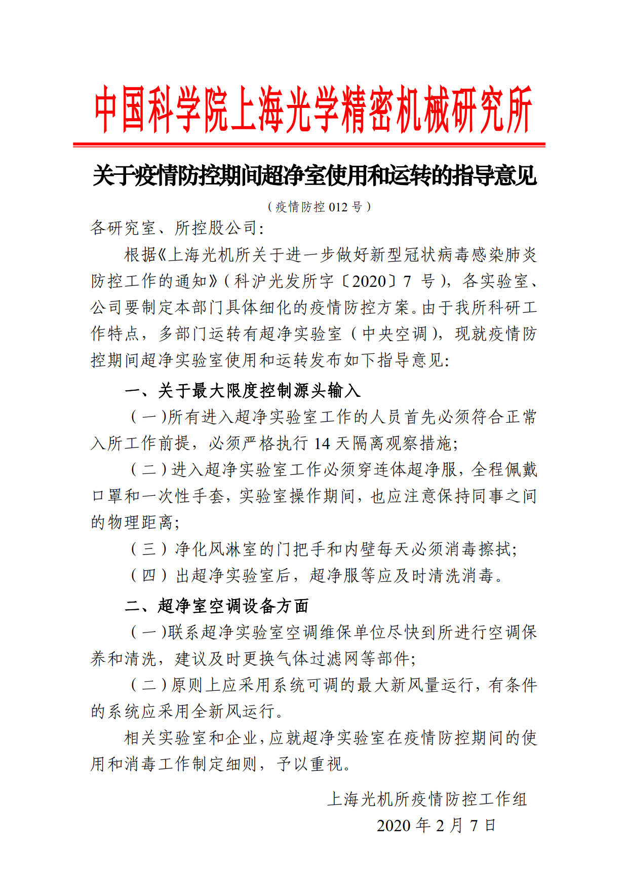 关于疫情防控期间超净室使用和运转的指导意见(疫情防控012号)
