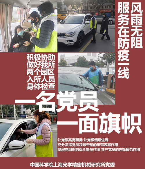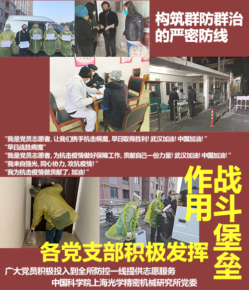 上海光机所党委认真贯彻落实党中央、中国科学院党组、上海市疫情防控工作要求,确保在防控疫情斗争中充分发挥上海光机所党组织的战斗堡垒作用和广大党员的先锋模范作用,推动各项工作落实落细,凝聚起群防群治群控的强大合力,让党旗在防控疫情斗争第一线高高飘扬。