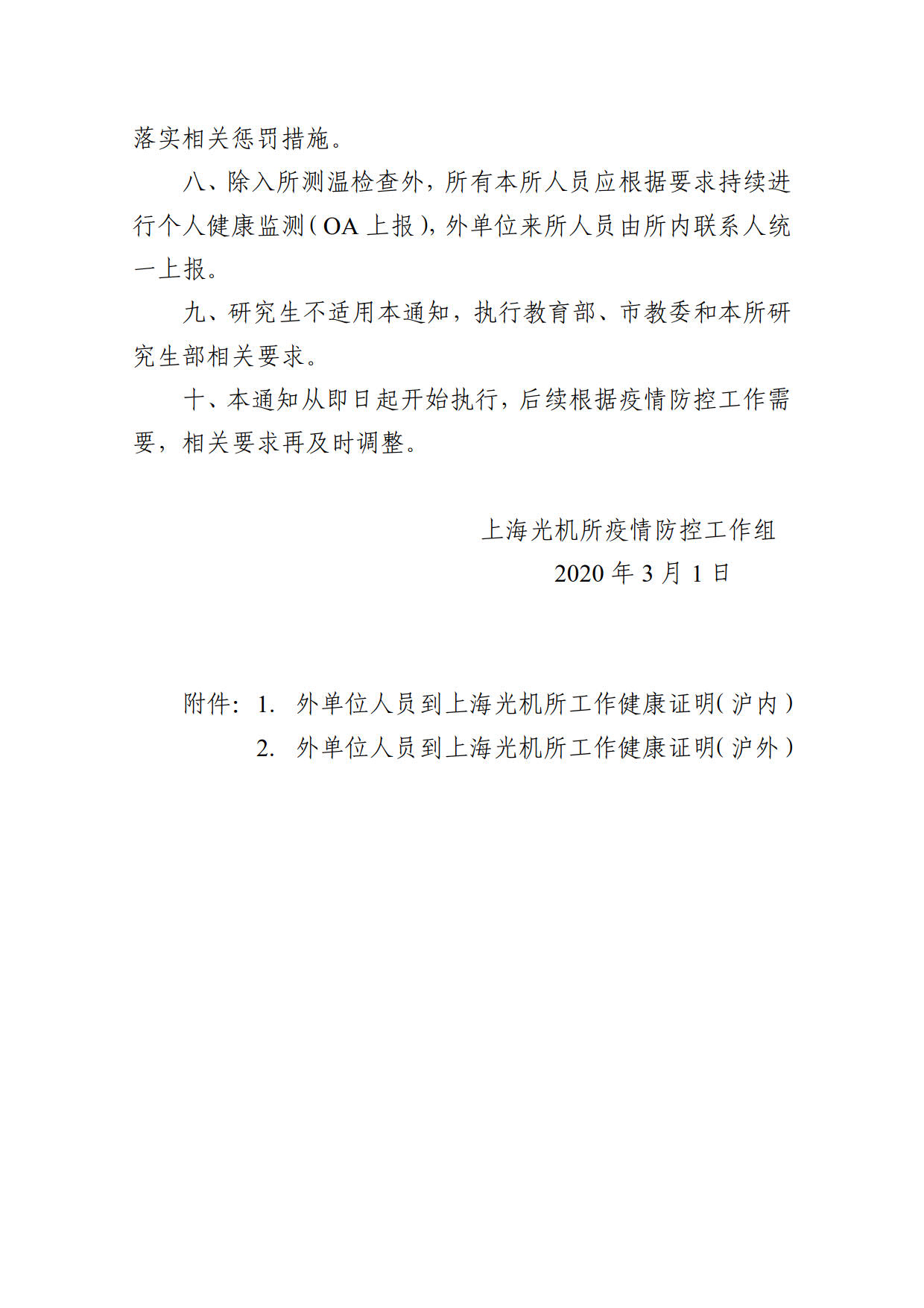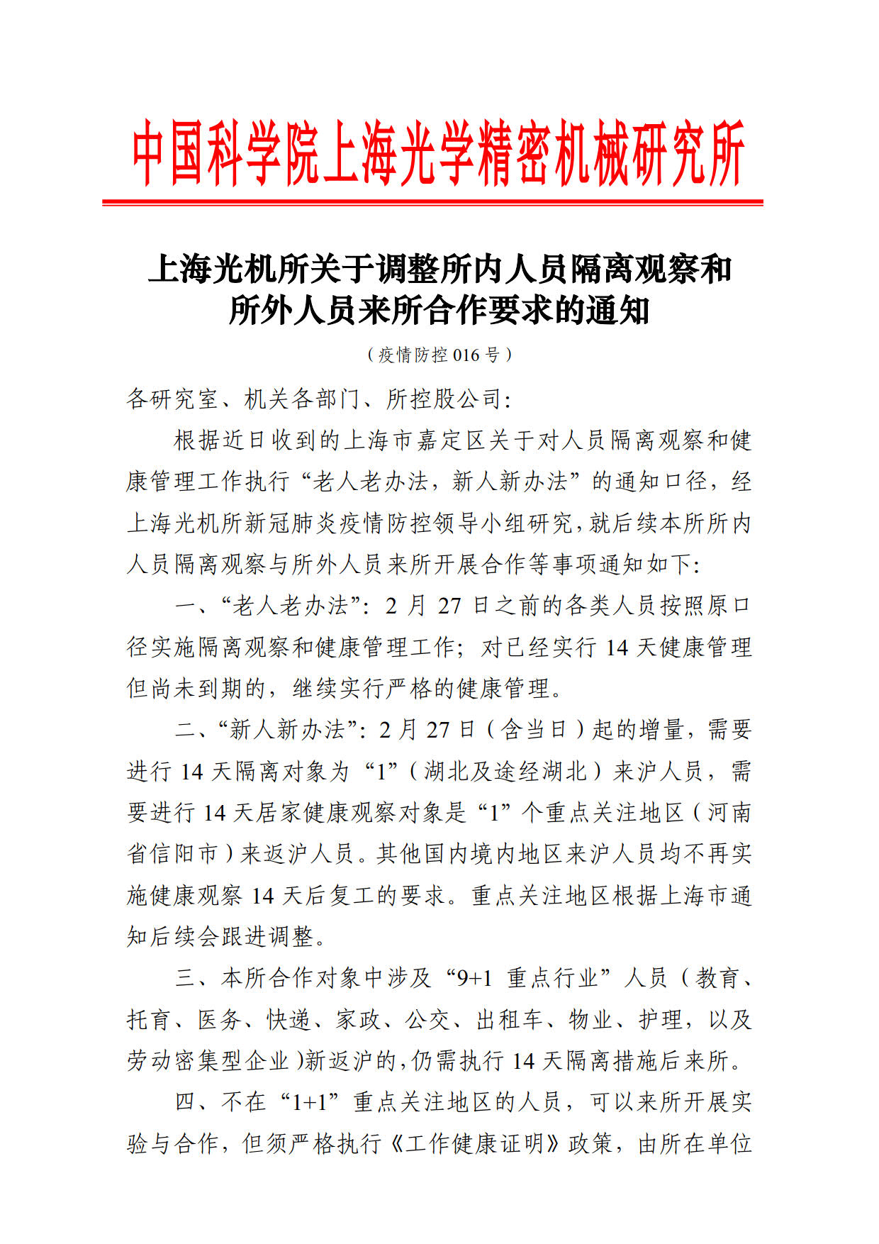上海光机所关于调整所内人员隔离观察和所外人员来所合作要求的通知(疫情防控016号)