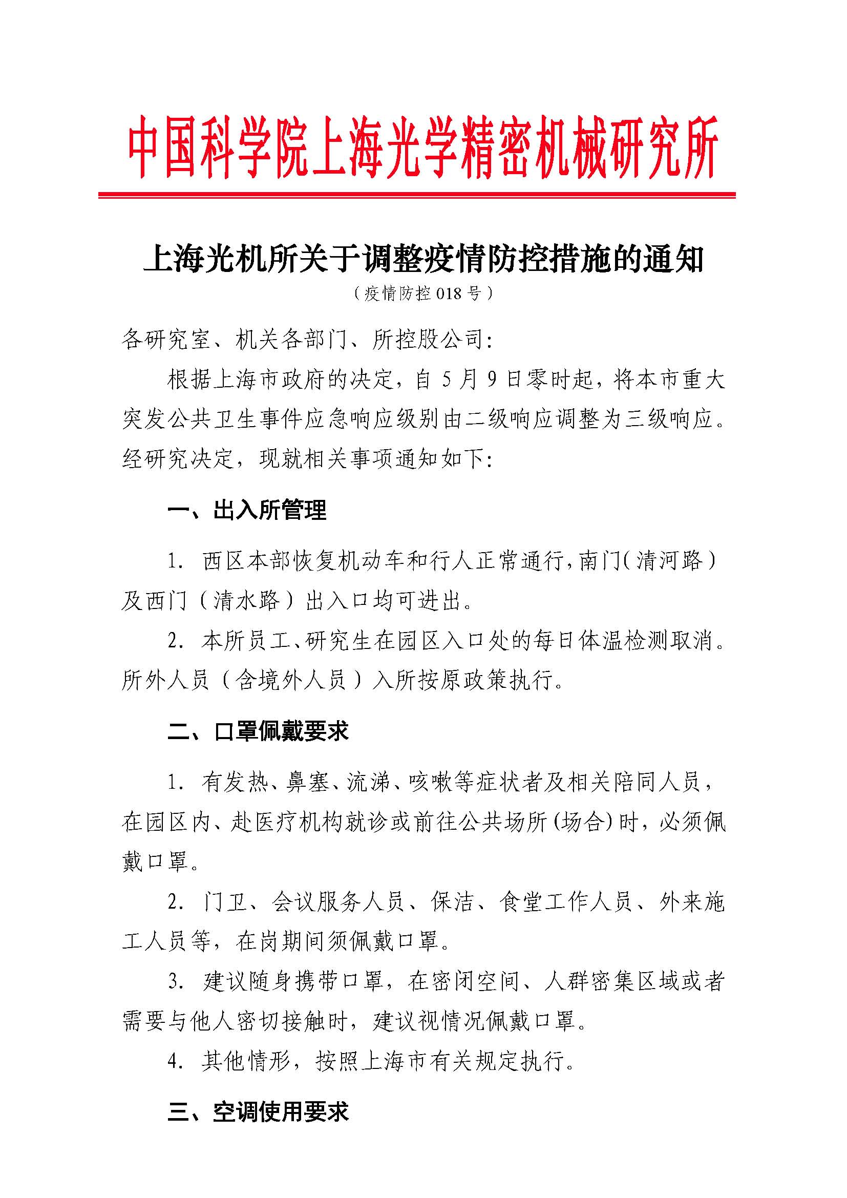 上海光机所关于调整疫情防控措施的通知(疫情防控018号)