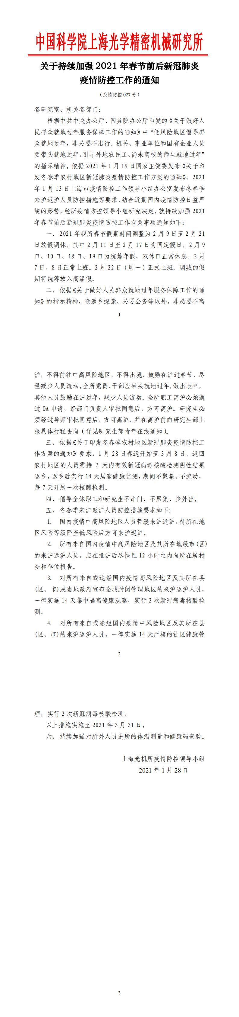 关于持续加强 2021 年春节前后新冠肺炎疫情防控工作的通知(疫情防控027号)
