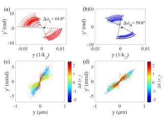 图1 电子束低能部分(a)和高能部分(b)横向相空间运动轨迹,相位补偿前(c)和相位补偿后(d)电子横向相空间分布