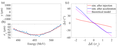 针对上述问题,研究团队设计了一种适用于激光尾波场加速电子束横向切片发射度的单发诊断方案。电子在空泡中除了受到纵向加速场,也会受横向聚焦力而产生横向振荡,而振荡的频率是和能量相关的,这就使得不同能量的电子在振荡的过程中会产生横向相位差。通过相位补偿,不同能量的电子在横向相空间上保持同一相位,束团呈现出切片信息。基于相位补偿,结合具有能散的电子束团经过一条聚焦束线后,其横向尺寸与能量的耦合关系,可以计算出电子束横向切片发射度。该方案的测量精度可以达到10 nm量级,经过优化在实验上测得发射度为0.27 mm mrad。精确的诊断方案可以作为发射度进一步优化的依据,根据测得的发射度,可以设计匹配的束线保证电子束长距离传输,实现台式化自由电子激光更高品质辐射输出。