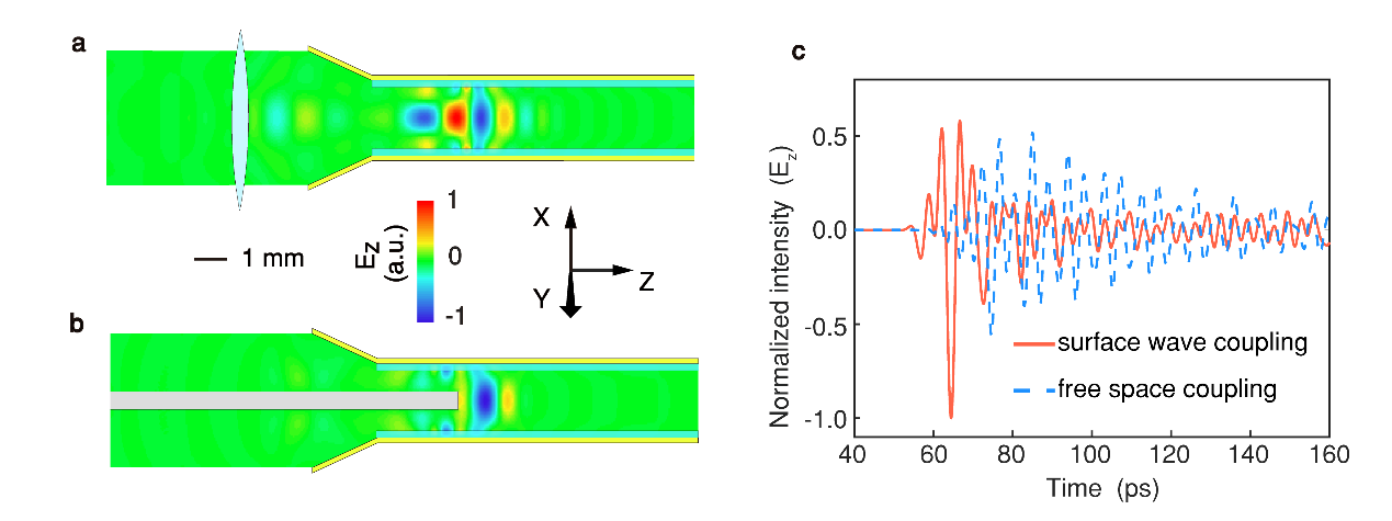 图3 自由空间(a)与金属圆柱波导(b)太赫兹耦合状态下,加速波导内的电场强度对比(c)