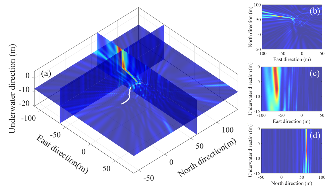 图1. 基于单根自沉缆构建曲线型提阵列的分布式三维定位结果。(a)以近场MUSIC算法估计的声源位置为中心的三维空间谱的三个正交剖面;(b)深度7.5 m处空间谱截面;(c)北向61.5 m处空间谱截面;(d) 东向-61.5 m处空间谱截面。