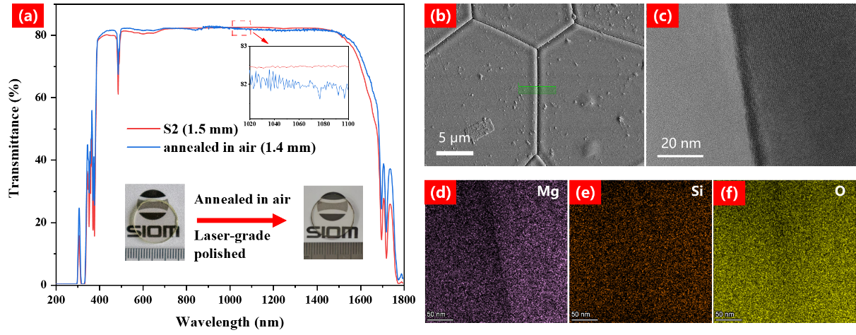 图1:TAG陶瓷的照片和透过率曲线,以及晶界的TEM图像和元素分析