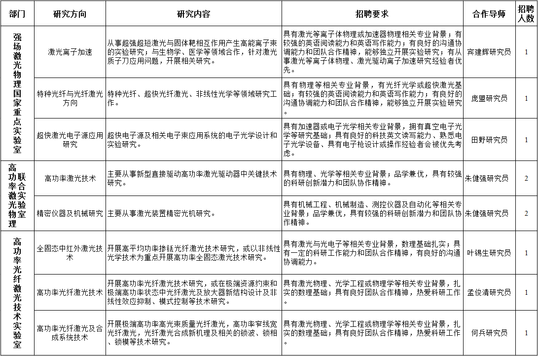 作为我国首批建立博士后流动站的科研单位之一,上海光机所目前设有物理学、光学工程、材料科学与工程3个博士后科研流动站。研究所重点学科领域为:强激光技术、强场物理与强光光学、空间激光与时频技术、信息光学、量子光学、激光与光电子器件、光学材料等。