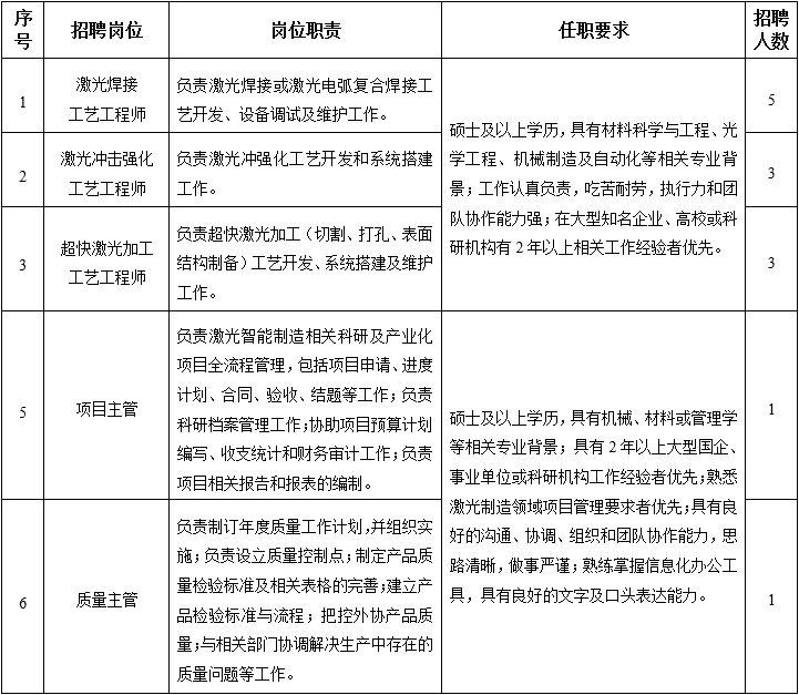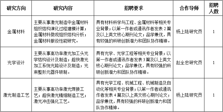 应聘人请将个人简历及1-3项代表性成果发送至邮箱zhaopin@siom.ac.cn,邮件主题为“×××应聘激光智能制造×××岗位”。