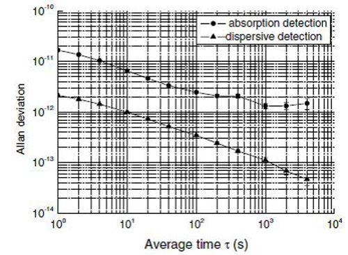 图2、正交偏振探测技术(三角形)和吸收探测技术(圆点)的原子钟阿伦方差对比