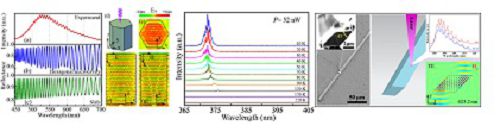 1)利用碳热还原合成技术,实验上首次实现垂直配置的一维ZnO法布里-珀罗腔,有效解决了传统平行配置的一维线状、带状微腔的额外光损失过大问题,并成功实现了室温下的紫外激射。该结果为未来微腔基紫外激光器的设计和应用奠定了前期实验基础,得到了审稿人高度评价,研究结果《Journal of Material Chemistry》上发表[J. Mater. Chem,22, 3069-3074(2012),影响因子6.101];