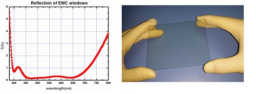 图示:电磁屏蔽窗口的反射谱(左)和产品照片(右)