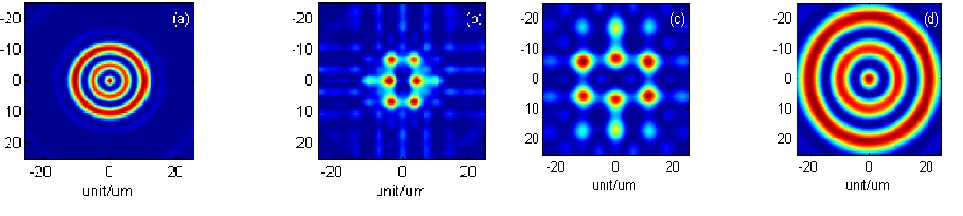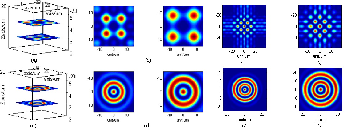 在特定条件下,该结构的M*N维可以降到1*N维,借助代数定理过渡到广义Fibonacci结构。相比于后者,前者的多层焦面之间的距离更容易实现微米和纳米级,因此更易用于生物细胞成像、显微、光刻等领域。而广义Fibonacci结构的多层焦面之间的距离更易具有宏观尺度,故此在长波段更易用于光学显示、虚拟投影技术、激光加工、激光分束、光束合成等。利用不同的波段可以实现从微观到宏观距离的自由调控。
