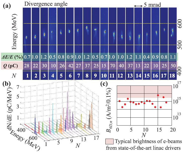 图(a) 实验测量的(530-580 MeV)高品质电子束能量和发散角分布;(b) 对应于(a)的高品质电子束能谱图;(c) 电子束的六维相空间亮度B6D,n , 可比拟于世界上最先进的直线加速器。