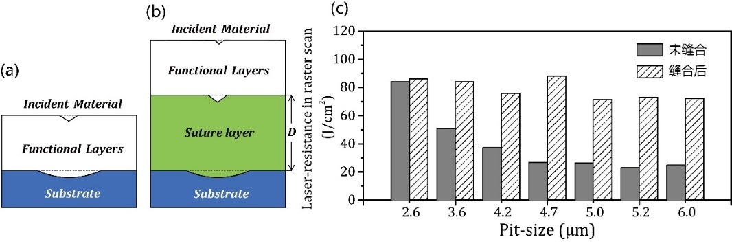 图1. 凹坑型缺陷“缝合”技术示意图:没有(a)和有(b)“缝合”层的多层膜样品示意图;(c)“缝合”技术对基频反射膜抗激光损伤阈值的提升效果。