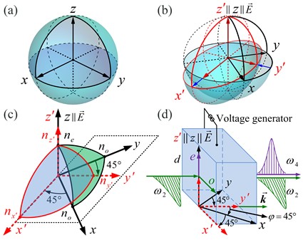 立方材料和(c)DKDP晶体电光效应折射率椭球变化;(d)电压调谐DKDP晶体四次谐波产生。