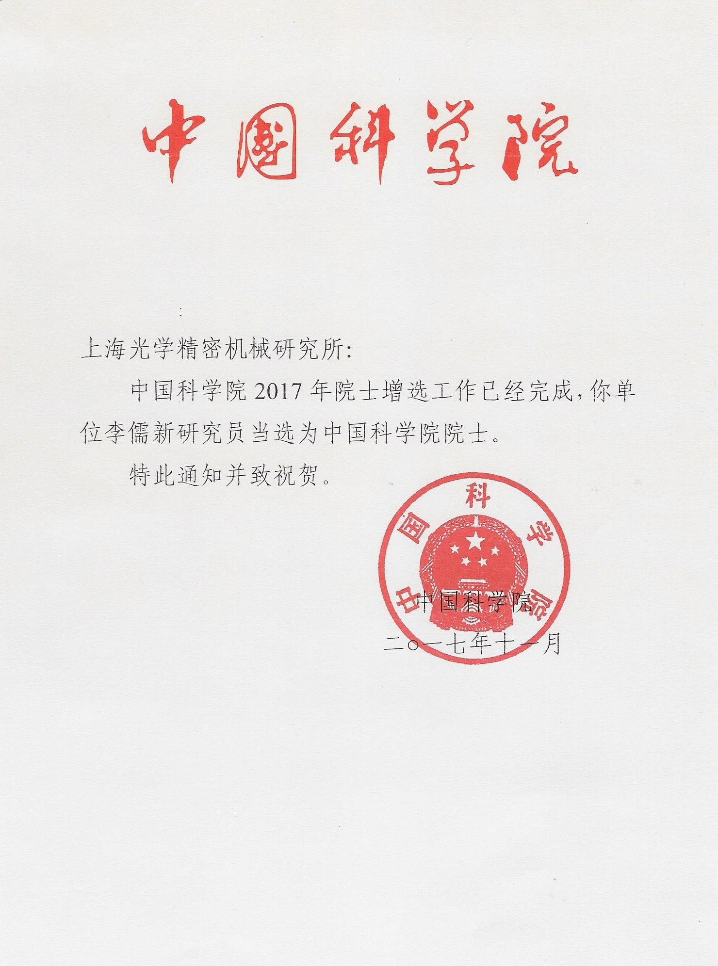 上海光机所李儒新研究员当选中国科学院院士。