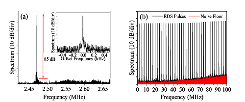 连续波泵浦的锁模拉曼光纤激光器效率、稳定性等性能远低于相应的稀土掺杂光纤激光器。作为一种非线性增益的激光器,泵浦激光器由纵模拍频等引起的时域起伏,会直接传递至激光,从而破坏拉曼光纤激光器的稳定性。课题组提出采用时域更为稳定的放大自发辐射源作为泵浦,在1.1mm波段实现了脉宽为1ps的稳定拉曼耗散孤子输出,射频谱信噪比达85dB。该研究成果发表于[Opt.Lett.42,5162(2017)]。