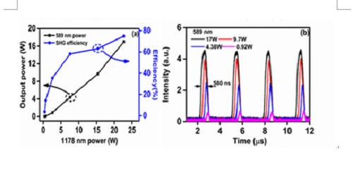 拉曼光纤激光技术可用于产生天文自适应光学系统中需要的589nm钠导星激光器。为克服地磁场对钠导星亮度的影响,需要重频约250-500kHz(拉莫尔重频,依赖于当地地磁场强度),占空比约20%的脉冲窄线宽589nm激光。课题组利用脉冲1120nm激光泵浦的窄线宽拉曼光纤放大器,获得了所需脉冲体制的1178nm激光,经过外腔谐振倍频,获得了17W的拉莫尔重频589nm钠导星激光,并成功研制了样机。该研究成果发表于[Opt. Lett. 42, 4351-4354 (2017)]。由于该激光器在远程磁场探测上的潜在应用,《激光聚焦世界》(Laser Focus World)以“Sodium guide star at Larmor frequency extends geomagnetic studies”为题进行了报导(2018年1月期)。