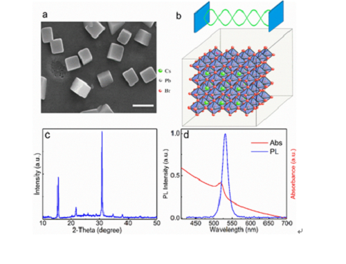 图1立方体钙钛矿光学性能表征。a)TEM形貌图。b)晶体结构及微腔示意图。c) XRD谱图。d)吸收谱和荧光谱。