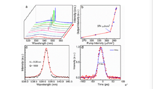 图2双光子泵浦频率上转换立方体微腔激射。a)单模激光。b)激射阈值。c)光谱宽度。d)输出时域脉冲。