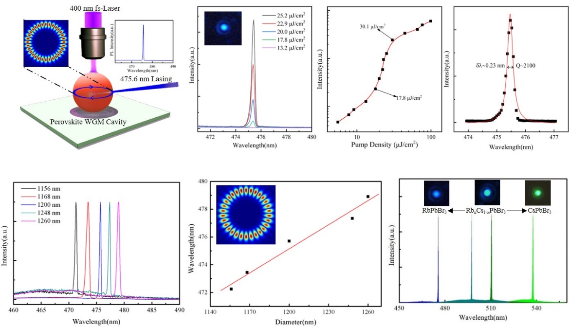 该项研究中,研究人员首先通过理论模拟解析了钙钛矿相与非钙钛矿相RbPbBr3的晶体结构,XRD衍射图谱及能带结构。理论解析得到钙钛矿相和非钙钛矿相RbPbBr3分别表现为直接和间接带隙,并且理论解析其钙钛矿相形成条件。基于改进的气相传输冷凝技术,结合热处理工艺,研究人员成功制备出了高品质亚微米尺度三维球形RbPbBr3,并在实验中实现了非钙钛矿-钙钛矿相转变,钙钛矿相RbPbBr3光学性能优异。研究人员通过系统研究RbPbBr3钙钛矿-非钙钛矿相转变发生的实验条件及化学机制,解析了无机钙钛矿材料相态转变的详细过程并阐明了其内在化学机制,为钙钛矿材料的相稳定以及光学性质的研究奠定了坚实的理论及实验基础。无机钙钛矿RbPbBr3微球表面光滑、结构规则、尺寸可控,在460nm具备良好的荧光吸收及发射性质,可同时用于增益介质及光学微腔实现微纳激光输出。研究人员在高品质RbPbBr3微球腔内实现了高品质、窄带宽蓝光单模激光输出(图1)。该研究理论结合实验,阐明了钙钛矿材料相变的详细过程及其内在化学机制,并将新型全无机钙钛矿RbPbBr3应用于高品质单模激光输出,为进一步解析钙钛矿材料晶体结构与光电性能的联系及相稳定的研究提供了坚实的理论及实验基础,对高品质微纳激光器件、多色激光器及激光显示等的研究具备重要意义。