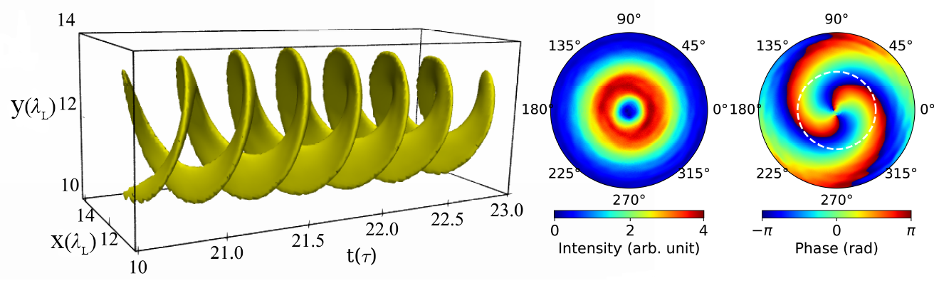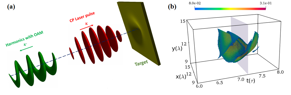 该项研究中,科研人员发现将相对论强度的圆偏振激光垂直入射到固体靶表面时,可以让平面靶的表面发生形变而形成一个凹槽结构。该凹槽结构使得垂直入射的非轴上的光变成了斜入射,从而能有效的振荡等离子体表面,进而产生表面高次谐波辐射。更为有趣的是该等离子体振荡相位取决于等离子体所在的方位角,从而将轨道角动量引入到产生的高次谐波辐射中。进一步分析发现,谐波中光子的轨道角动量是由多个驱动光子的自旋角动量转化而来,而且该转化过程满足角动量守恒定律。