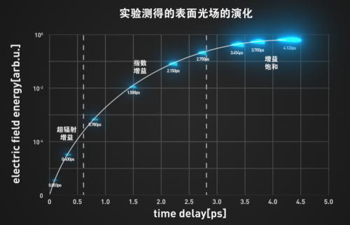 近年来,作为半导体集成电路基础的微纳制造工艺不断进步,使集成化的自由电子光源成为可能。围绕小型化自由电子相干光源,研究团队展开飞秒激光驱动的超短电子脉冲泵浦SPP种子研究,采用超快光学泵浦-探测技术,观测到自由电子脉冲对SPP的相干放大。实验通过对SPP的电磁场时空波形、能量以及频谱的记录,首次动态演示了SPP受激辐射放大的动力学过程,并揭示了SPP经历了高增益自由电子激光中超辐射、指数增长和饱和等三阶段的受激辐射光放大过程。该项研究创新发展了自由电子泵浦实现SPP相干放大的全新途径,在光谱探测、传感、信息处理等应用领域具有重大应用价值。