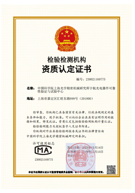 经过CMA资质认证后,我所可靠性中心在检验检测范围内可出具具备法律效力的检测结果和检测报告,该检测结果和检测报告可用于产品质量评价、成果及司法鉴定等用途,为我所科研需求和其它社会需求提供公正、科学和权威的检测服务。